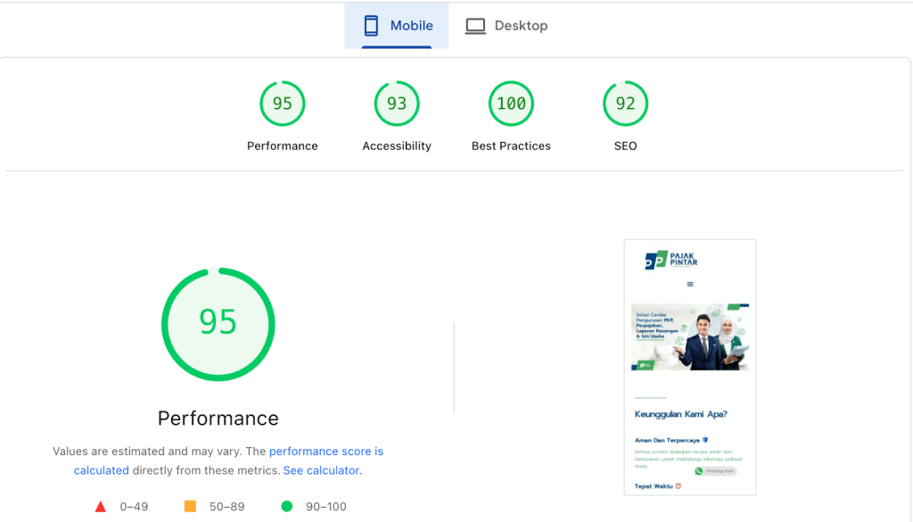 Seperti yang salah satu klien kami, Pajak Pintar memiliki score mobile speed sesudah melakukan revamp website, sebagai berikut: